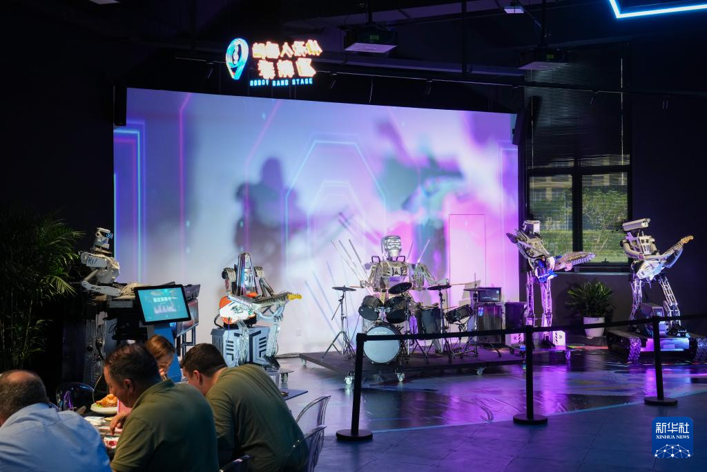 在位于北京經(jīng)開區(qū)的“機(jī)器人焰究所”主題餐廳內(nèi),機(jī)器人樂隊(duì)在進(jìn)行表演(8月6日攝)。