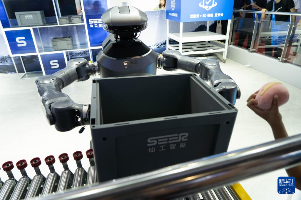 世界機器人大會上展出的一款物流分揀機器人(8月8日攝)。