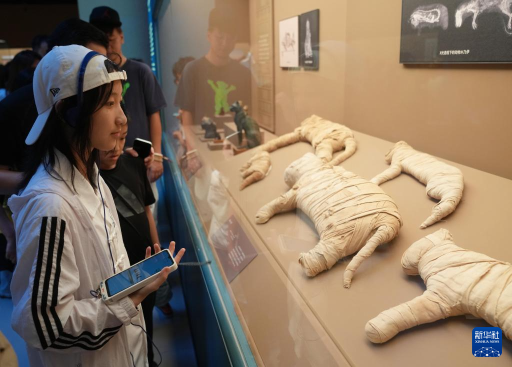 8月11日晚,觀眾在上海博物館展廳內參觀貓木乃伊。