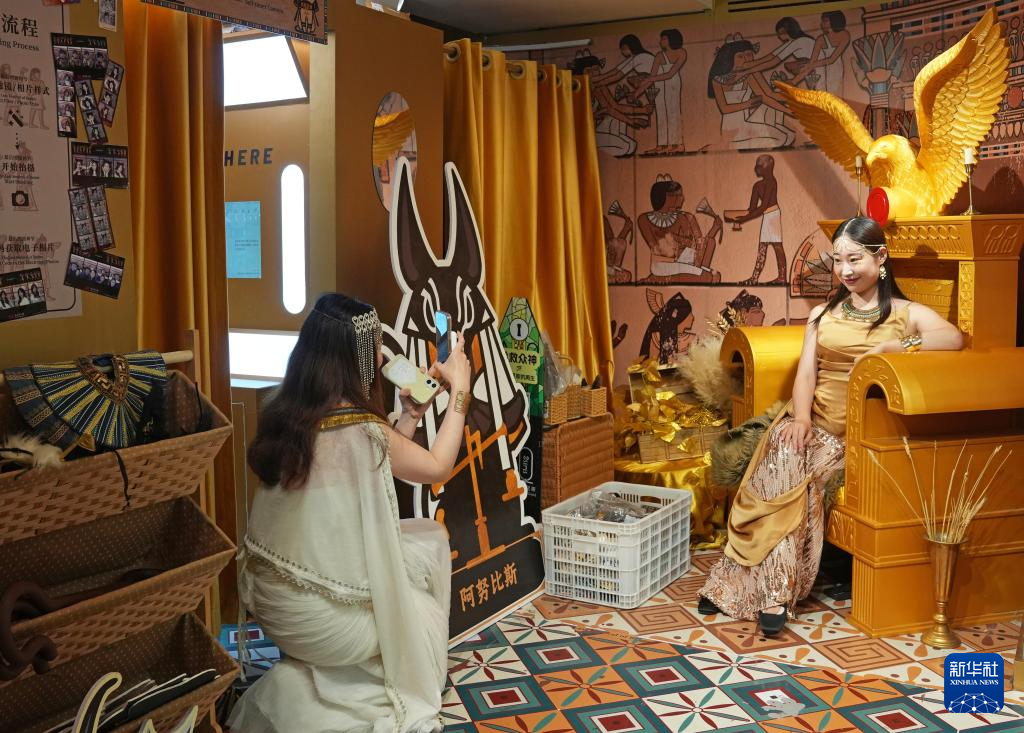 8月11日晚,觀眾在上海博物館文創(chuàng)商店拍攝埃及風(fēng)格形象照。