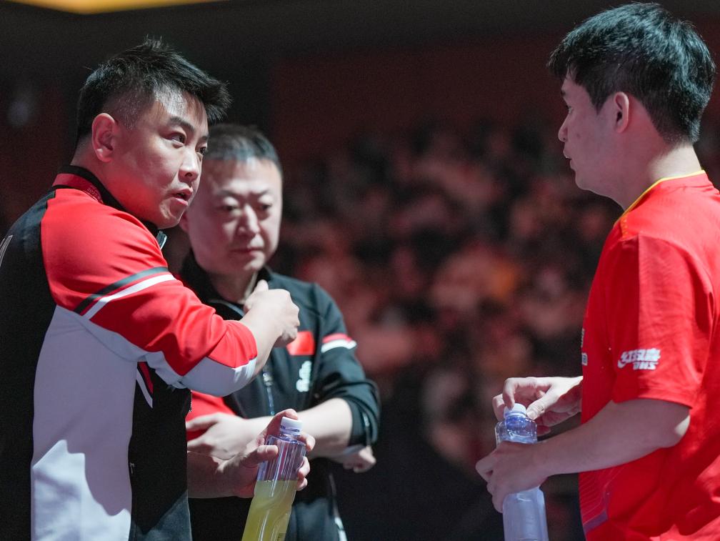 11月30日,中國隊教練王皓(左)在男單比賽中指導(dǎo)林詩棟。新華社記者 王曦 攝