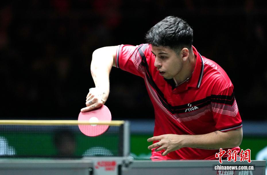 12月1日,四川成都,智利隊隊員尼古拉斯·博格斯在男子單打比賽中。當(dāng)日,2025年成都國際乒聯(lián)混合團(tuán)體世界杯第一階段比賽中,中國香港隊以8:2戰(zhàn)勝智利隊。
