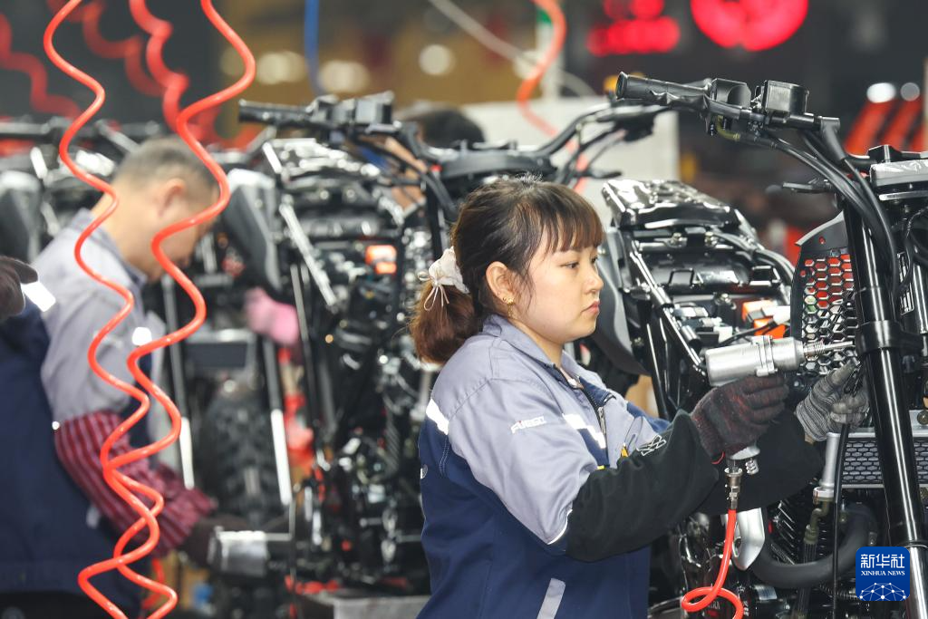 12月2日,在重慶炙焱動力制造有限公司,工人在生產(chǎn)線上組裝出口的摩托車。
