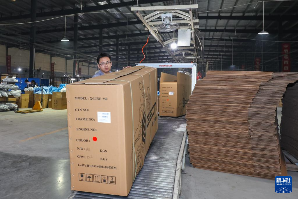 12月2日,在重慶炙焱動(dòng)力制造有限公司,工人將打包好的摩托車推下包裝線。